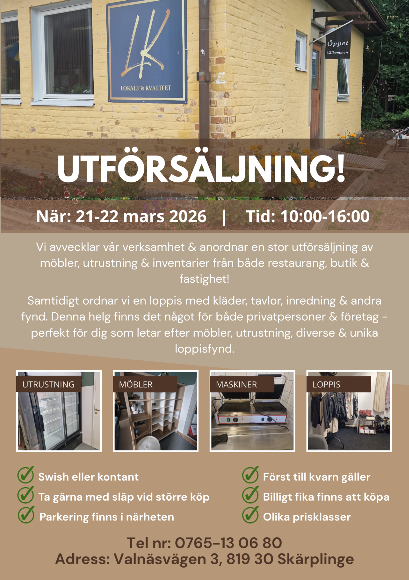 Under samma helg arrangerar vi även loppis med kläder, inredning, tavlor och unika fynd. Perfekt för både privatpersoner och företag som letar efter bra saker till riktigt bra priser.